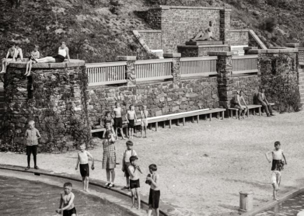 1933 schuf der Auer Künstler Emil Teubner die Figur „Mutter mit Kind“, die an der Schmalseite des Beckens zwischen den je 6 neuerrichteten Startblöcken zur Aufstellung kam. Wikipedia: https://de.wikipedia.org/wiki/Emil_Teubner